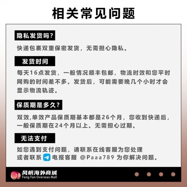 海淘声明: 本商城于海外运营,下单付款代表已同意您的海淘/代购行为。 权利声明: 商城上的所有商品信息、客户评价、商品咨询、网友讨论等内容,是商城重要的经营资源,未经许可,禁止非法转载使用。注:本站商品信息均来自于合作方,其真实性、准确性和合法性由信息拥有者(合作方)负责。本站不提供任何保证,并不承担任何法律责任。 服务 正品保证✅极速发货✅隐私保护✅售后保障✅ 规格 1盒10粒 配送 快递发货 声明 本商品为境外商城运营,下单即视为您个人海淘行为